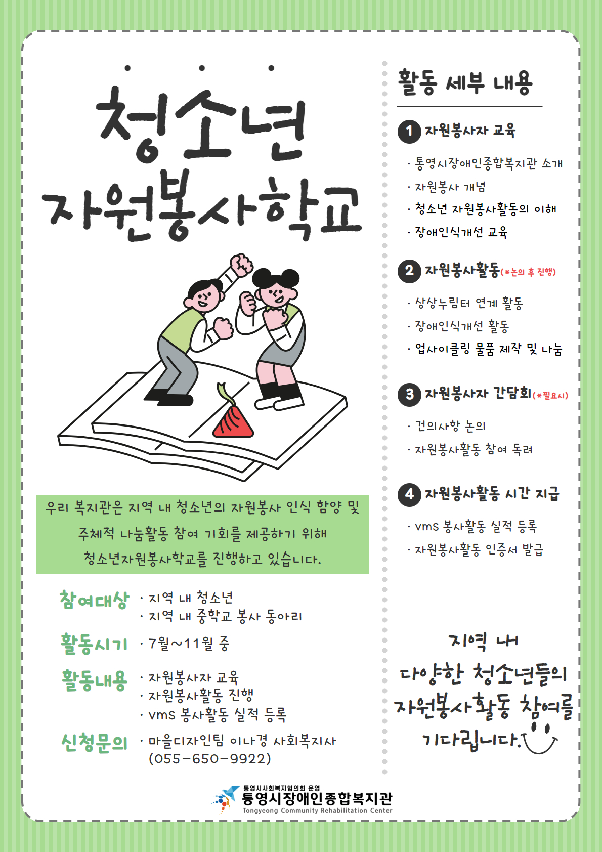 통영시장애인종합복지관에서 진행하는 청소년자원봉사학교 참여자 모집 안내입니다.