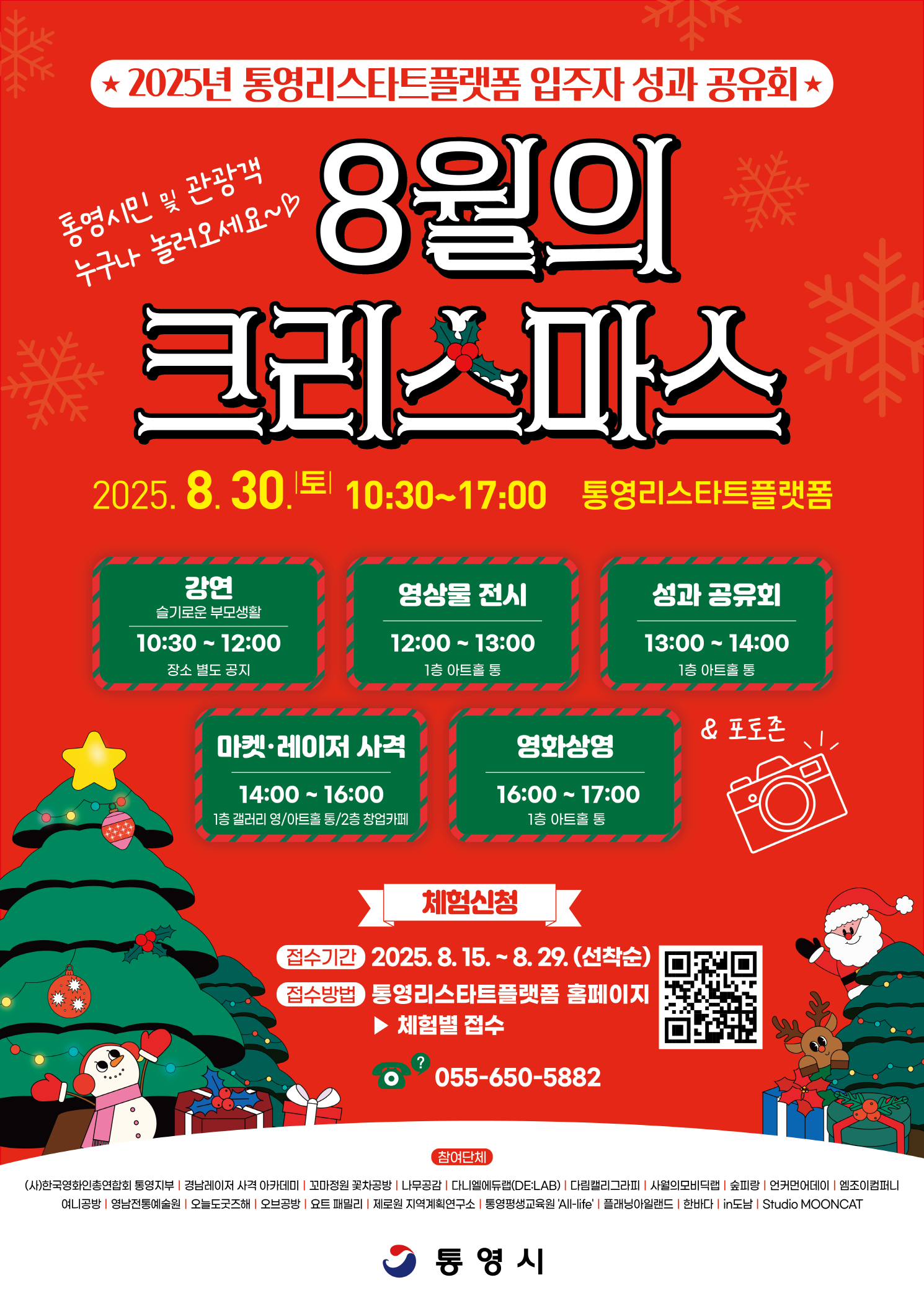 2025년 통영리스타트플랫폼 입주자 성과 공유회 '8월의 크리스마스' 프로그램 안내입니다.